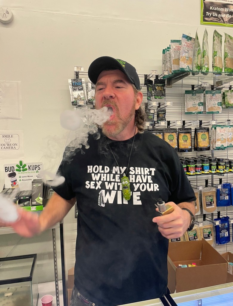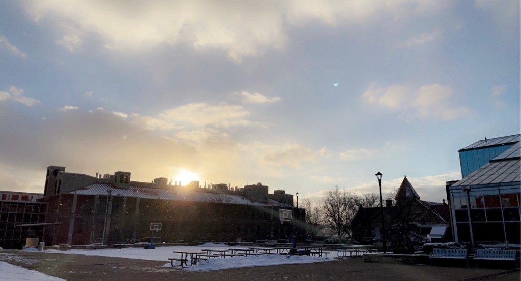 Portrait of Aurora Caton on her future school, Lehigh University’s campusInteraction between a puppy for sale in a pet shop and a girl who sympathizesLight peeking over WVU while the snow fallsGlass Gone Wow owner, Dave, doing smoke tricks