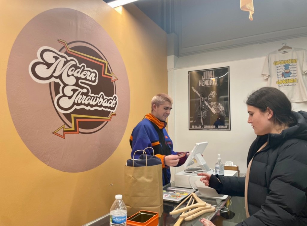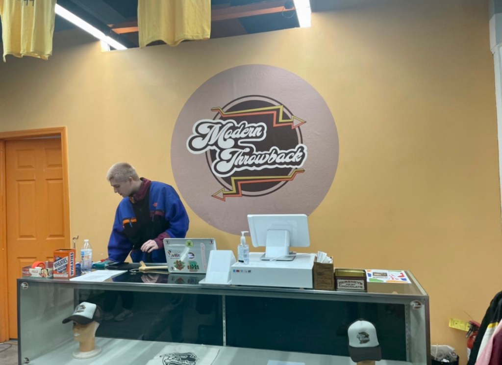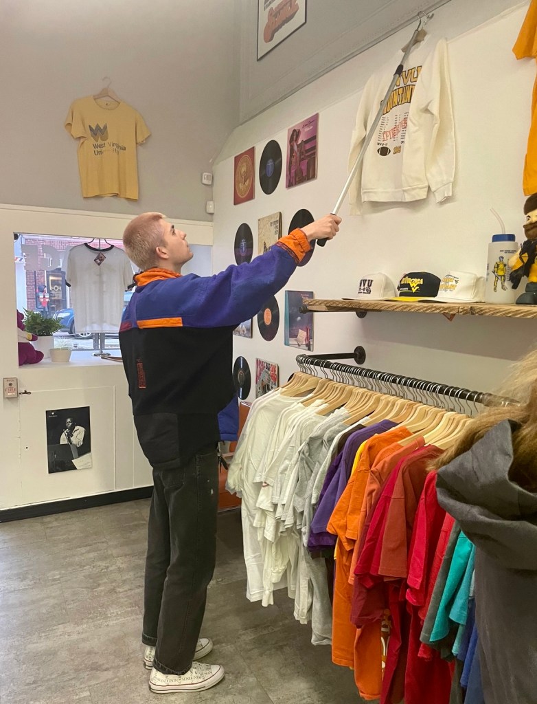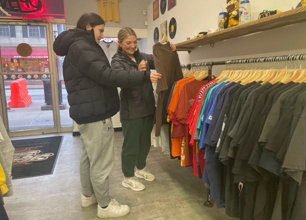 Chayt Luevano, WVU Alum, opened up “Modern Throwback,” on High St. to sell vintage clothing, a life long dream of his. WVU students look through the Modern Throwback collection eyeing a t-shirt for sale. The store opened up in August, 2021 and continues to thrive Monday through Thursday from 12-6 p.m.Along with owning the shop Luevano works hard to manage and maintain it to attract students. Luevano actively interacts with customers to maintain a happy environment.